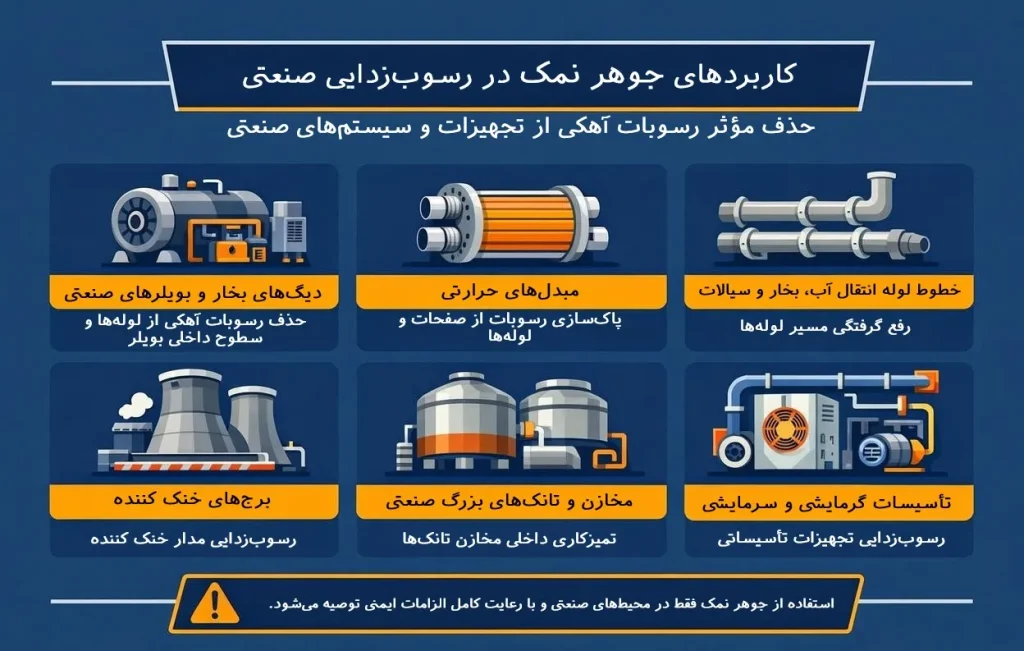 از کاربردهای جوهر نمک برای رسوب زدایی صنعتی میتوان به موارد زیر اشاره کرد: