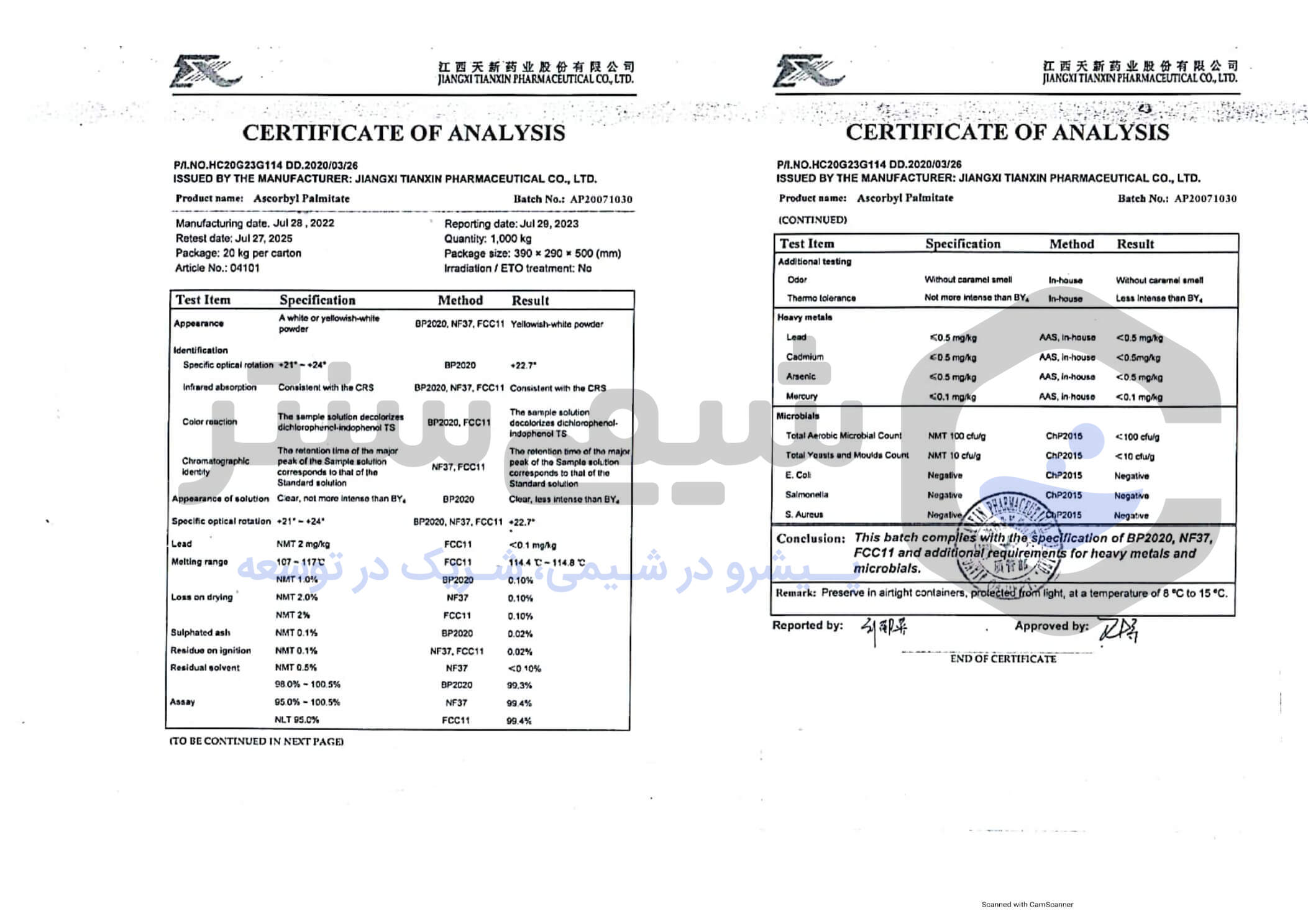 آسکوربیل پالمیتات واقعا در ماندگاری مواد غذایی خیلی اثرگذاره من از شیمی سنتر برای کارگاه تولیدیم سفارش دادم بخاطر قیمت های معقولی که دارن و با این حال محصولات کیفیت بسیار بالایی دارن و ارسالش در زمان کمی صورت میگیره و بسته بندی محصولات جنس خوبی دارد اصلا نگران سلاکت محصول در طی پروسه ارسال نمیشید.