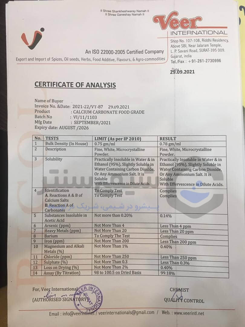 کربنات کلسیم Calcium carbonate یک ماده ی معدنی با خاصیت ضد اسیدی، افزایش پایداری در گرید صنعتی ، کشاورزی،غذایی و تولید رنگ به کار می رود برای خرید تماس بگیرید Product Currency: IRT Product Price: 80000 Product In-Stock: InStockخرید کربنات کلسیم صنعتی و خوارکی[برند veer] باکیفیت💯 تضمینی
