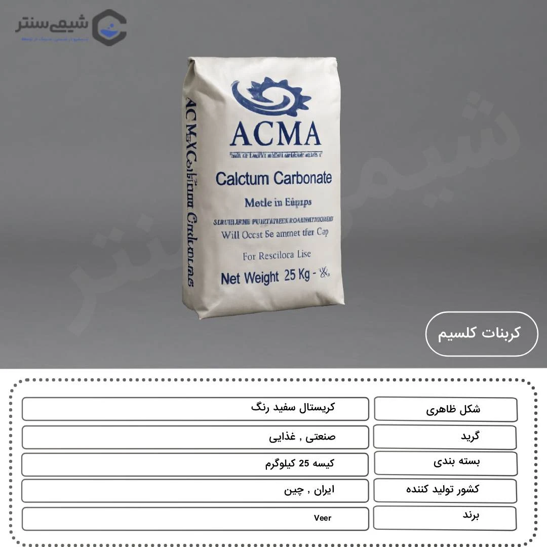 شیمی سنتر سایت فروش مواد شیمیایی، عرضهکننده کربنات کلسیم در دو نوع سنگین و سبک با کیفیت بالا، تولید ایران و چین، در دو گرید صنعتی و غذایی میباشد. کربنات کلسیم Veer به صورت کریستال سفید رنگ با خلوص عالی ارائه شده و در بستهبندیهای استاندارد ۲۵ کیلوگرمی قابل عرضه است. کربنات کلسیم Veer، با کاربرد گسترده در صنایع مختلف، انتخابی مطمئن برای مشتریان حرفهای میباشد.جهت خرید کربنات کلسیم به صورت پودری و مستربچ و استعلام از قیمت، با کارشناسان واحد فروش ما در تماس باشید.