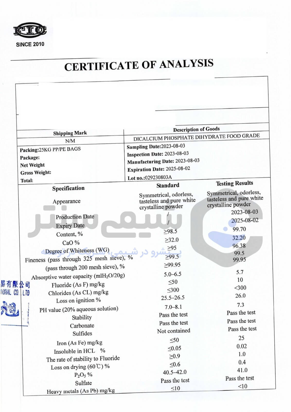 شیمی سنتر، فروشگاه اینترنتی مواد شیمیایی با 10 سال سابقه درخشان در زمینه مشاوره و ارائه خدمات فروش مواد شیمیایی، کیفیت محصولات خود را تضمین می کند. قیمت دی کلسیم فسفات طیور چینی به دلیل وارداتی بودن و فاکتور دلار، در نوسان می باشد. جهت استعلام از قیمت روز با کارشناسان ما در تماس باشید.