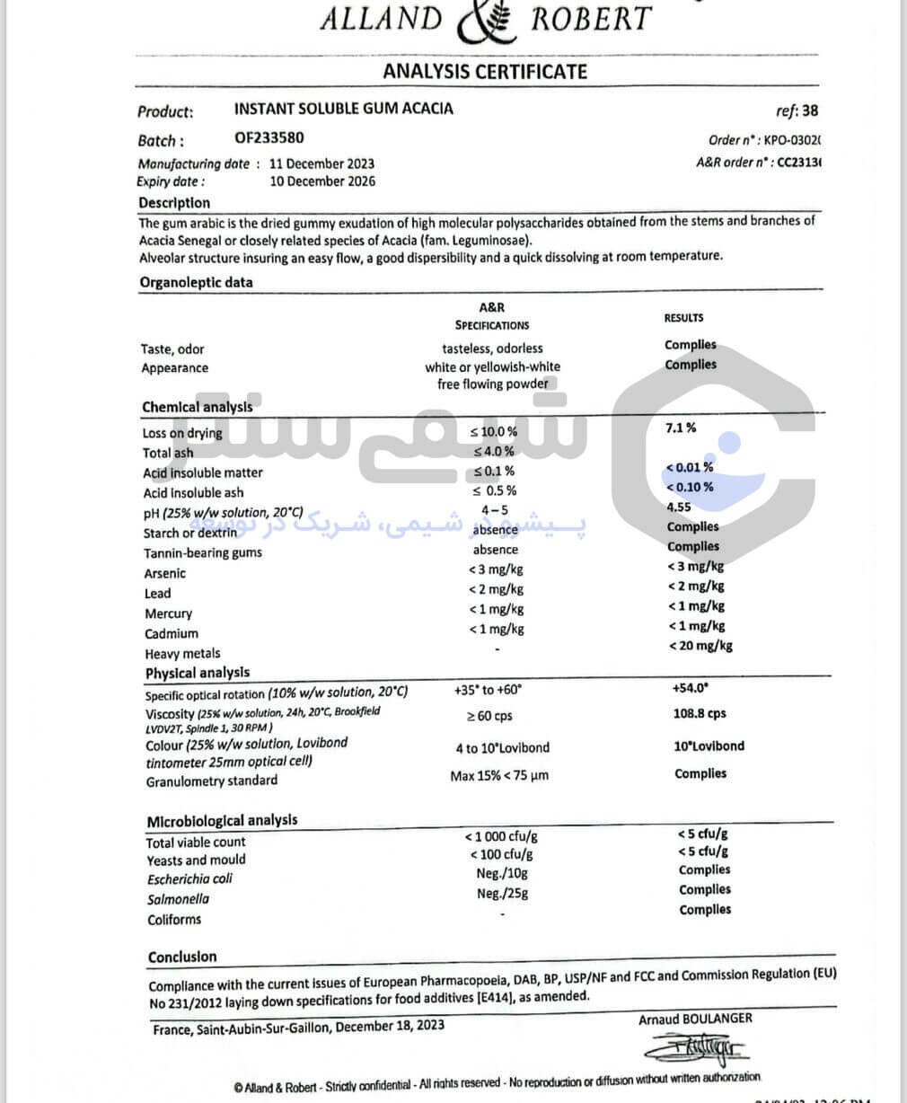 مشخصات شیمیایی و فیزیکی صمغ عربی