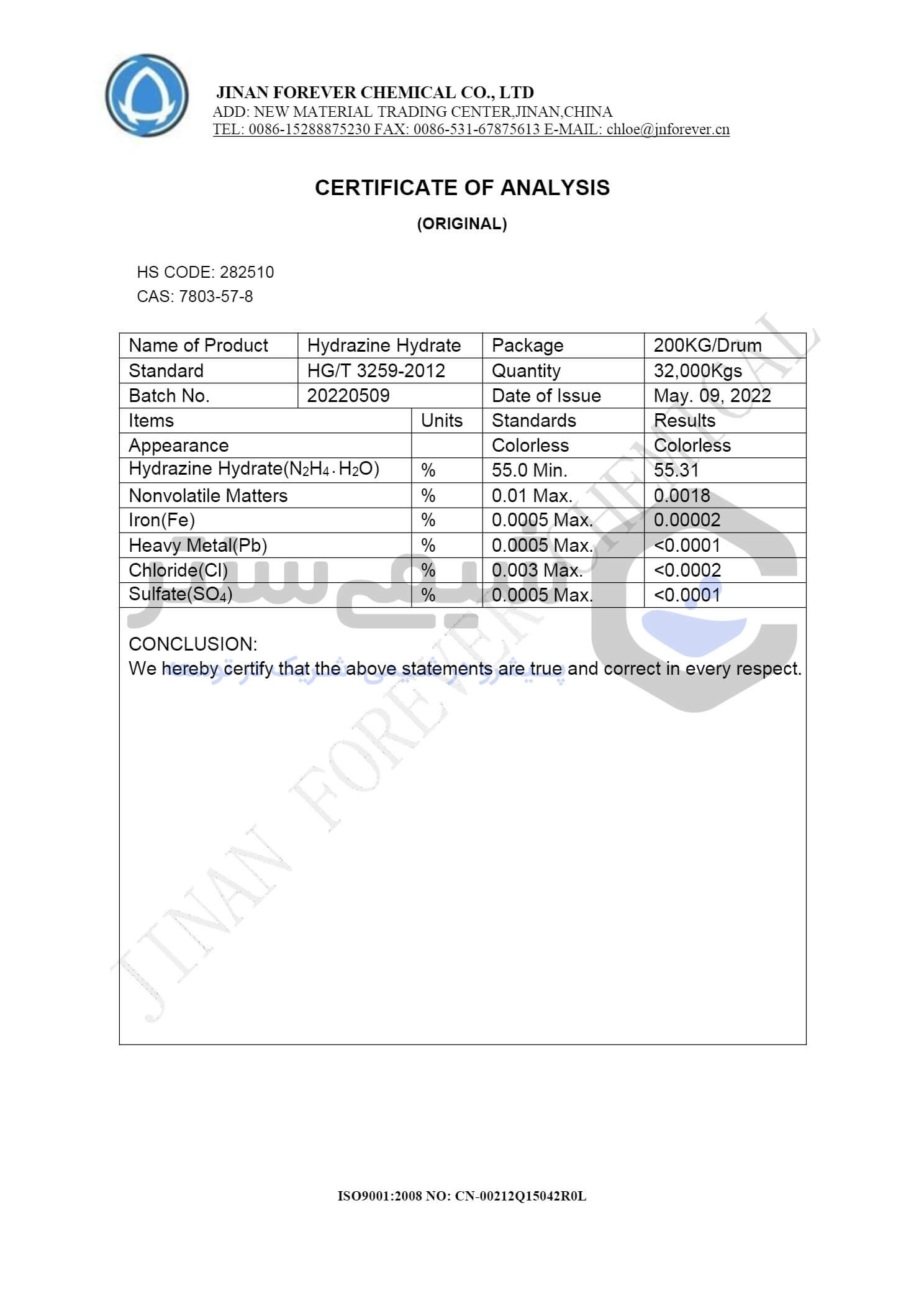 آیا فرآیند فروش هیدرازین هیدرات شما شامل تضمین‌هایی مانند ارائه برگه آنالیز (COA) و گواهی‌نامه‌های معتبر است ؟؟
