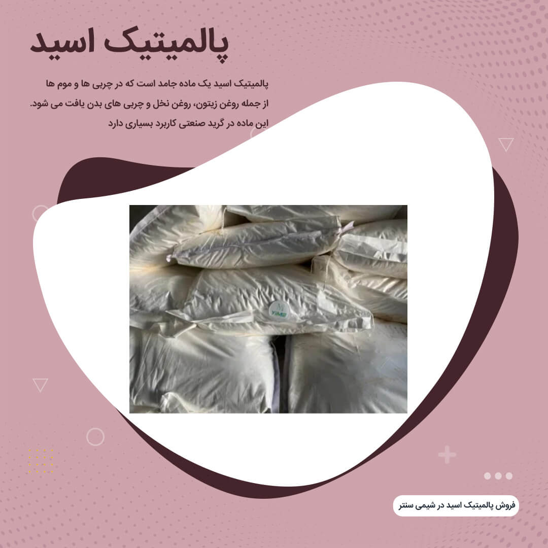 شیمی سنتر، فعال در حوزه خرید و فروش مواد اولیه شیمیایی، پالمیتیک اسید را در کیسه های 25 کیلویی به فروش می رساند.