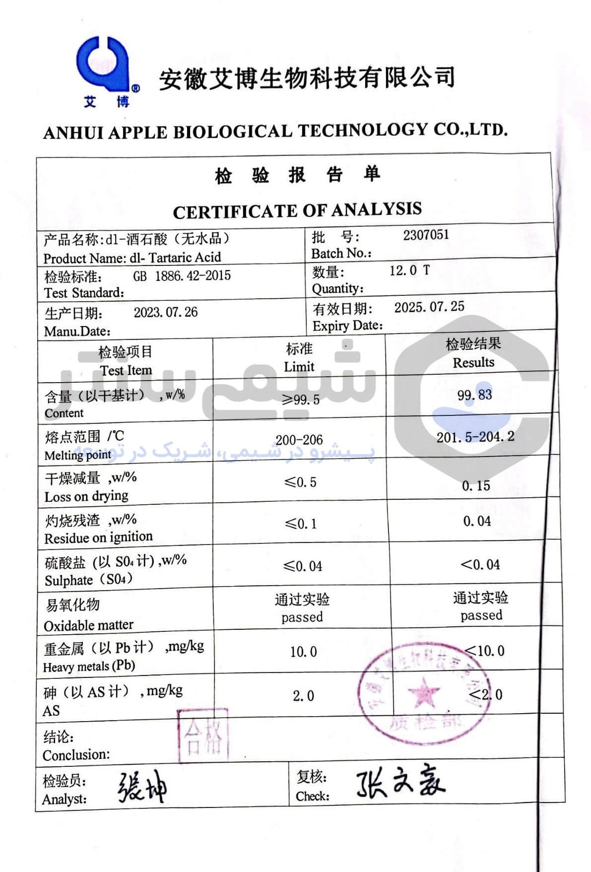 اسید تارتاریک با خلوص 99% و گرید غذایی در بسته بندی های 25 کیلوگرمی توسط برندهای چینی عرضه می شود. این محصول مناسب استفاده در صنایع غذایی بوده و از کشور چین وارد می گردد. برای استعلام قیمت مواد شیمیایی از جمله اسید تارتاریک و دیگر محصولات شیمیایی موجود در شیمی سنتر، می توانید با کارشناسان فروش ما تماس حاصل فرمایید.