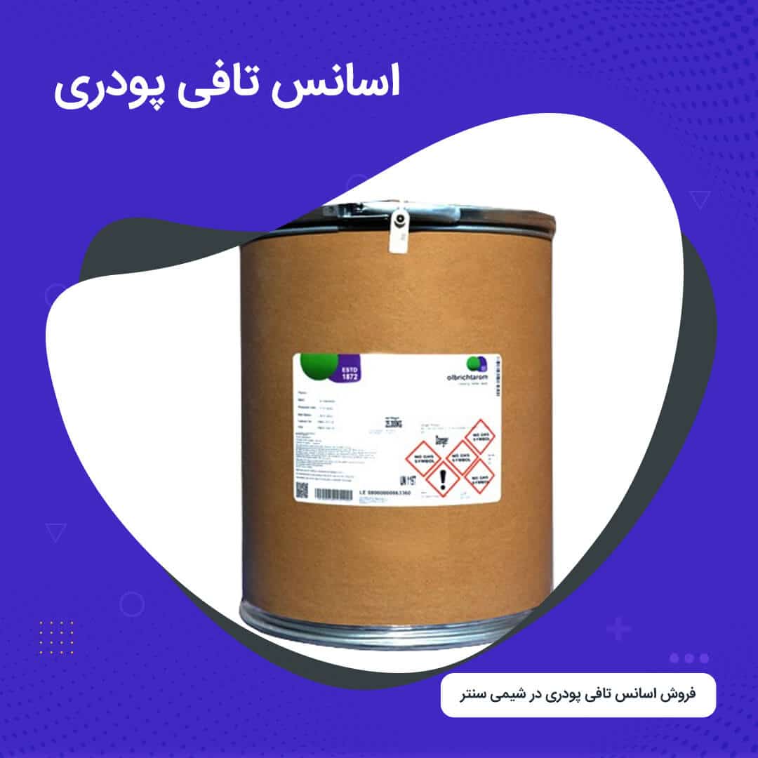 اسانس تافی پودری یک ترکیب معطر با بویی دلپذیر است که در حالت فیزیکی پودر عرضه می‌شود و رایحه‌ای قوی دارد. به دلیل غلظت بالای آن، تنها مقدار کمی از این محصول برای هر بار استفاده کافی است. اسانس تافی پودری کاربرد گسترده‌ ای در تهیه کیک‌ ها، شیرینی‌ ها، دسر های مختلف مانند ژله، و همچنین شکلات دارد. همچنین می‌توان از این اسانس برای معطر کردن چای استفاده کرد. علاوه بر این، اسانس تافی پودری می‌تواند در تولید ماسک‌ های مو و کرم‌ های معطر نیز به کار رود.