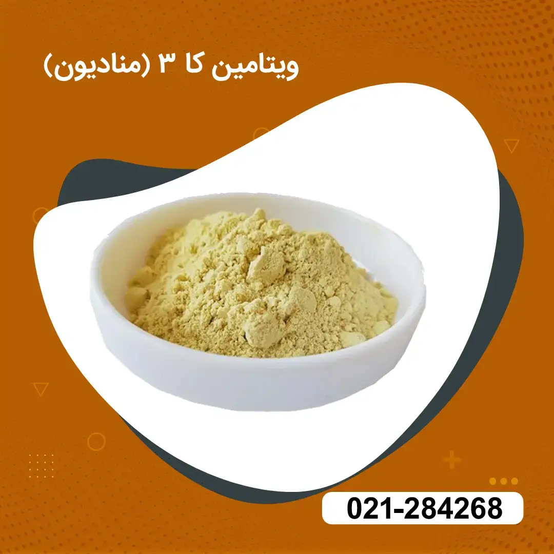 ویتامین کا ۳ (منادیون) یک ماده پودری با خلوص 99.9% است که بهعنوان یک ترکیب شیمیایی موثر در صنایع دارویی کاربرد دارد. این محصول با برندهای معتبر آلمانی، چینی و هندی در بستهبندیهای 25 کیلوگرمی در درام و کارتن قابل ارائه میباشد. منادیون در گرید دارویی تولید میشود و برای حفظ انعقاد طبیعی خون و درمان کمبود ویتامین K در بدن اهمیت دارد.